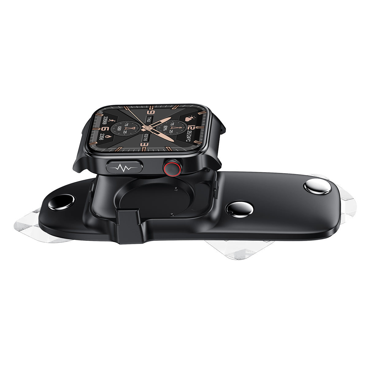You can measure ECG by hand: After removing the watch strap, buckle it on the ECG stand.The heart rate and ECG waveform can be detected in PTT mode.